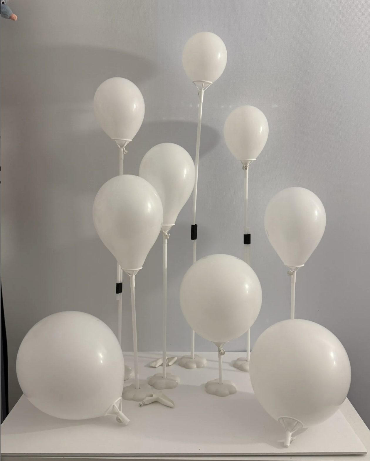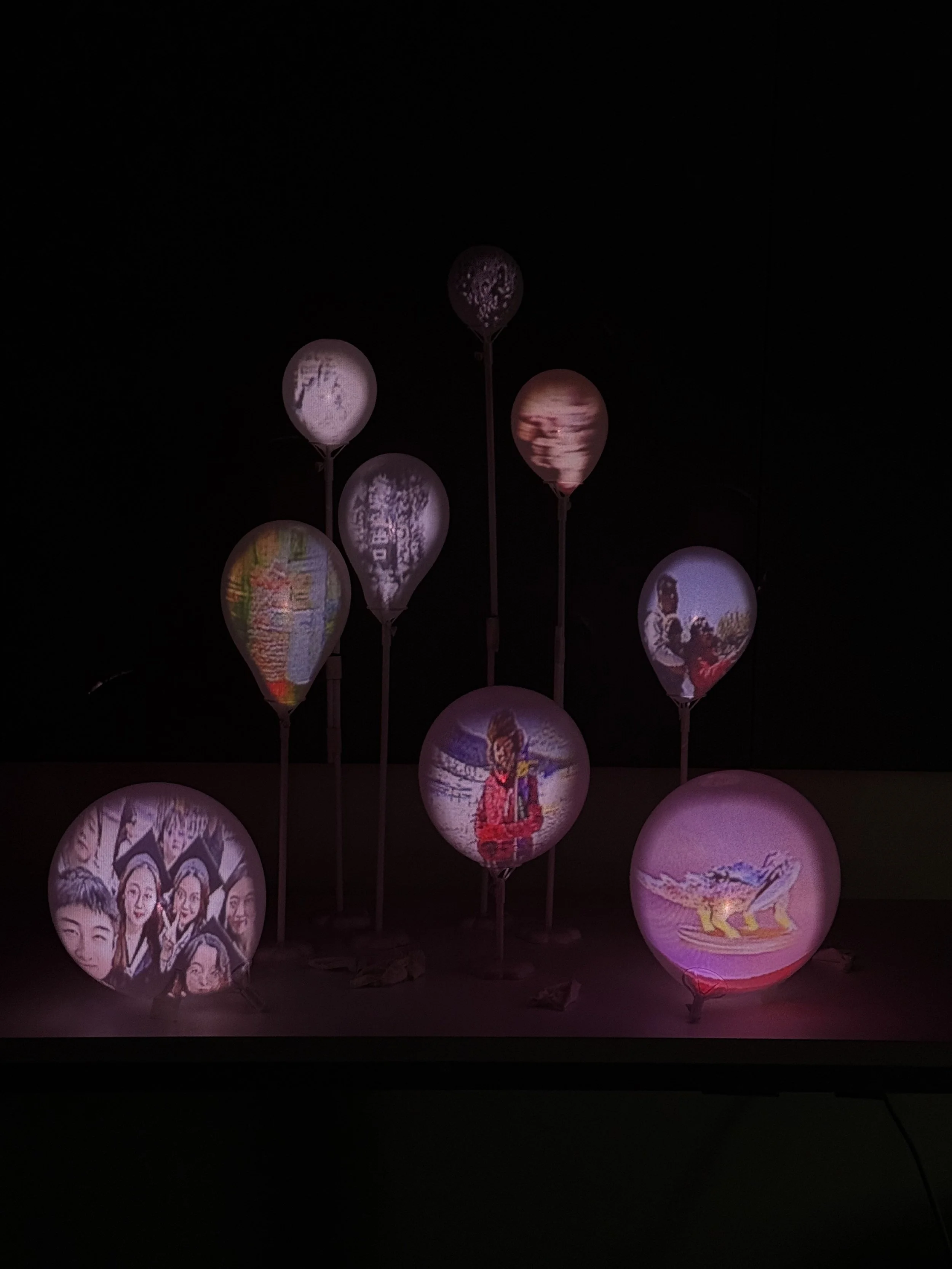I placed the balloons at different heights and used an Optoma projector on a tall tripod to project the images. I edited the images before projecting them. Older photos were made very blurry to represent forgotten memories, while more recent photos were only slightly blurred or kept clear.