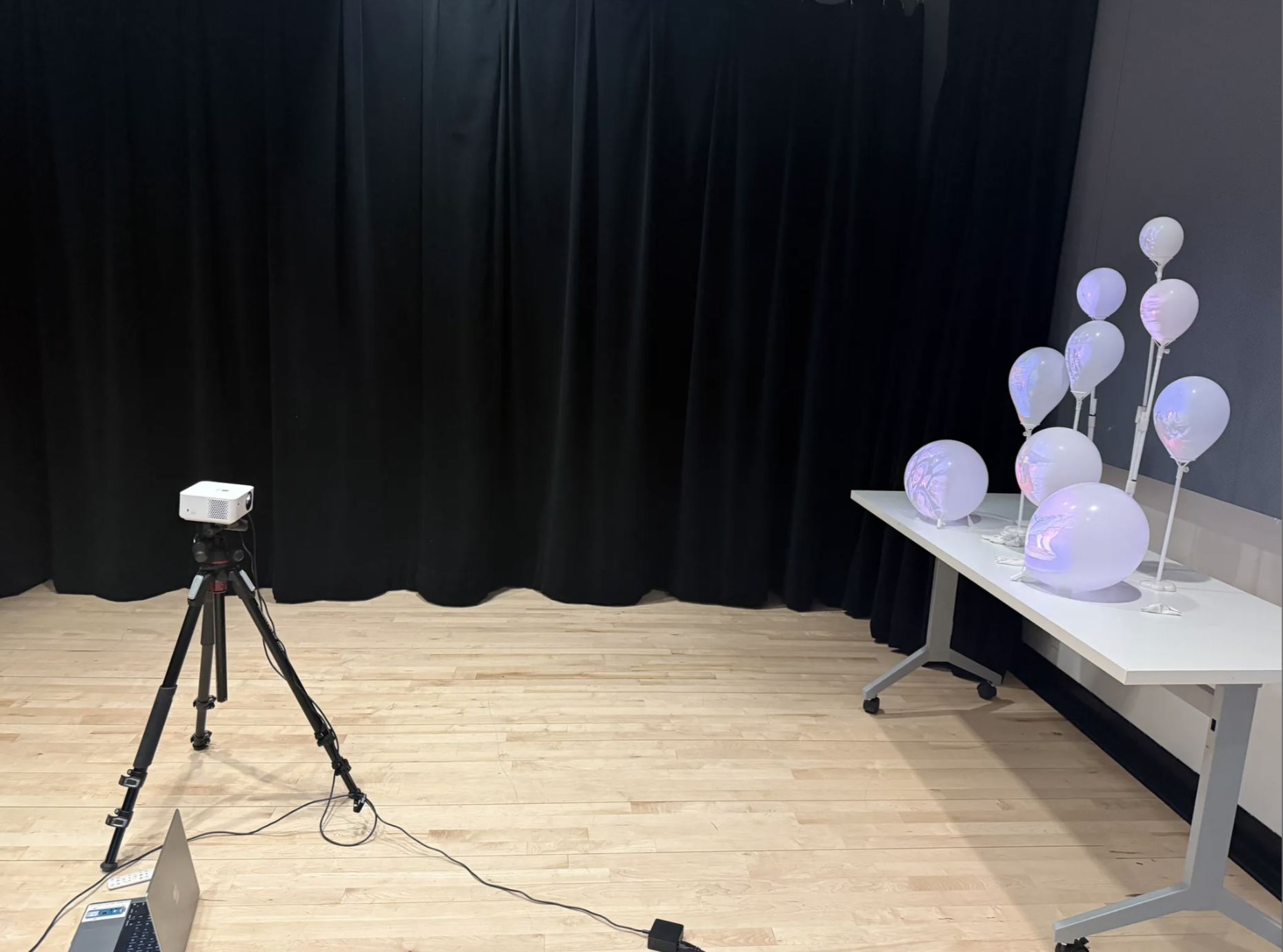 Weightless Memory is a projection mapping project that explores how memories gradually fade over time. Images are projected onto suspended balloons, using them as a metaphor for memory. As balloons rise, shrink, and disappear, they represent memories becoming distant and unclear, while lower balloons reflect recent and vivid moments. The project is inspired by Daniel Canogar and Gerhard Richter, combining physical space and blurred imagery to create an immersive experience of memory and time.